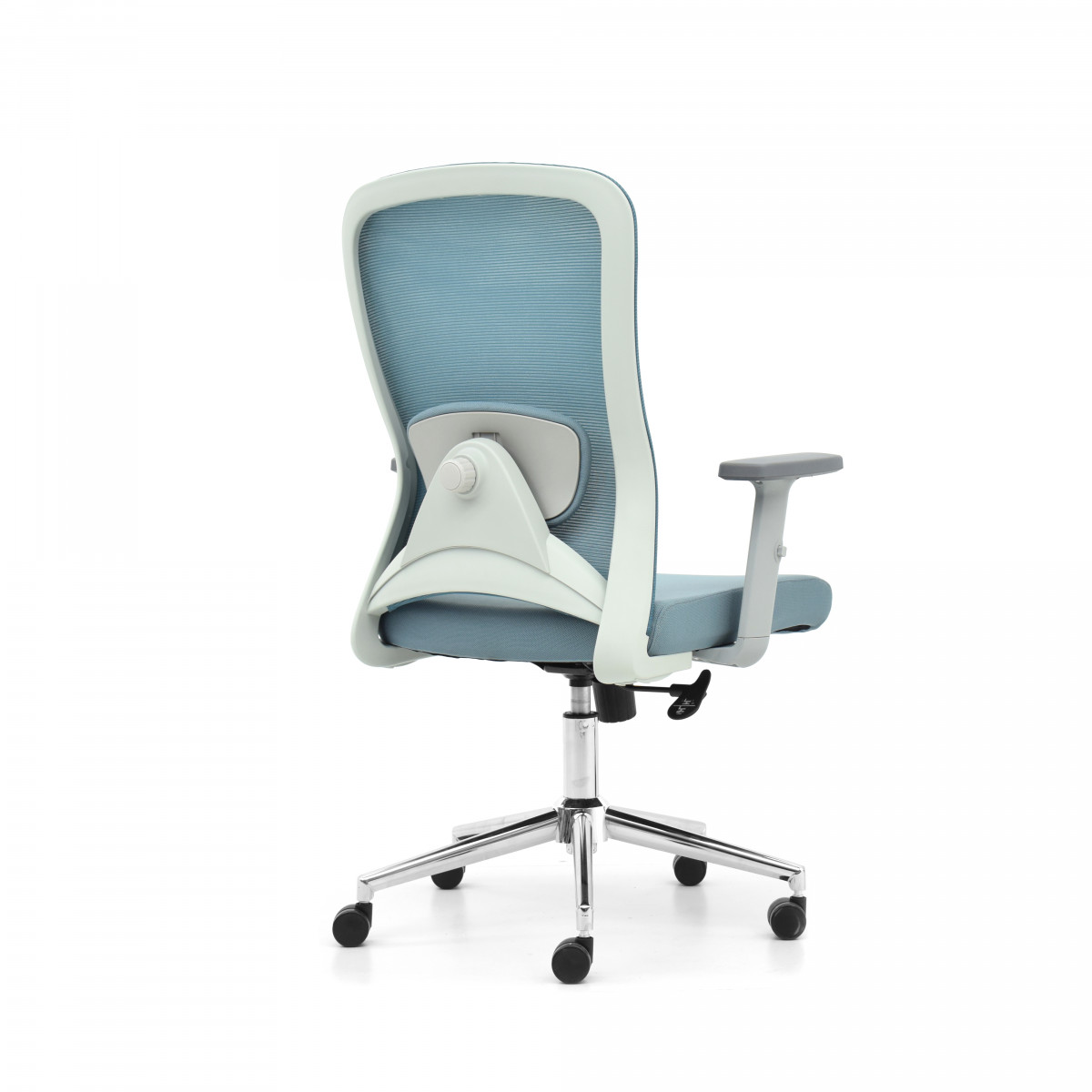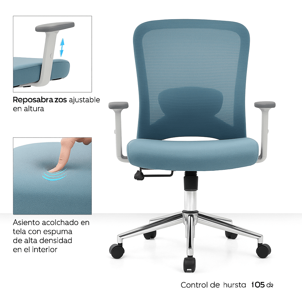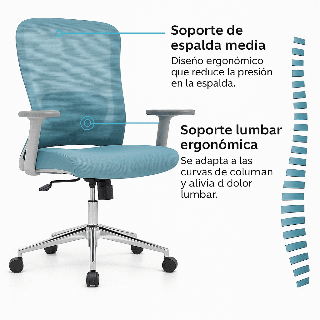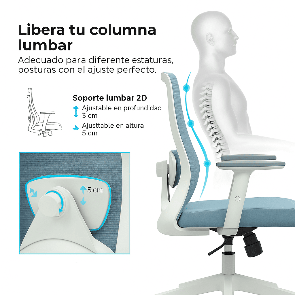 Equipada con un respaldo de malla de media altura, esta silla favorece la circulación del aire y mantiene una temperatura agradable incluso en jornadas intensas. Su estructura se adapta de forma flexible a la espalda del usuario, y gracias al soporte lumbar 2D ajustable, permite una correcta alineación de la columna, ayudando a reducir la fatiga y mejorar la postura.