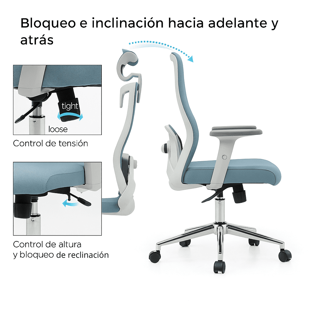 Además, cuenta con un mecanismo de inclinación con bloqueo, que permite reclinar el respaldo y fijarlo en una posición estable, adaptándose a las necesidades del usuario en cada momento, ya sea para trabajar, leer o descansar brevemente.
