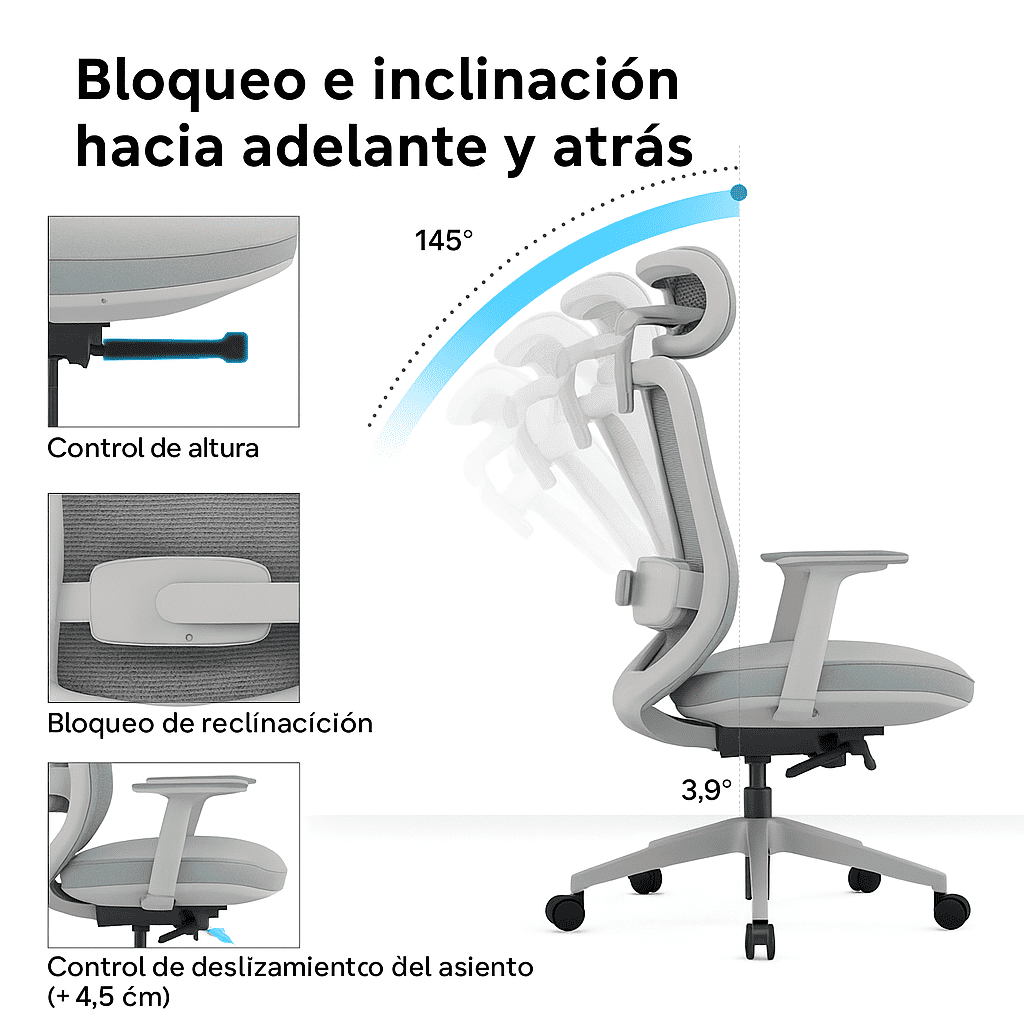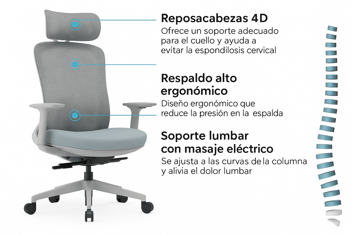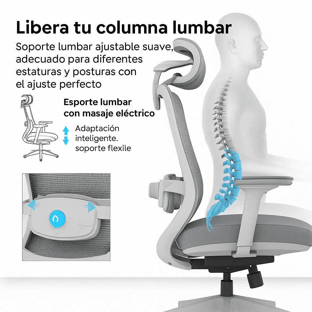 Uno de sus grandes diferenciales es el sistema de masaje lumbar eléctrico integrado, ideal para reducir la fatiga y aliviar la tensión muscular en la zona baja de la espalda. A través de un discreto panel de control, puedes activar esta función cuando lo necesites, convirtiendo tu espacio de trabajo en un lugar más saludable y relajante.