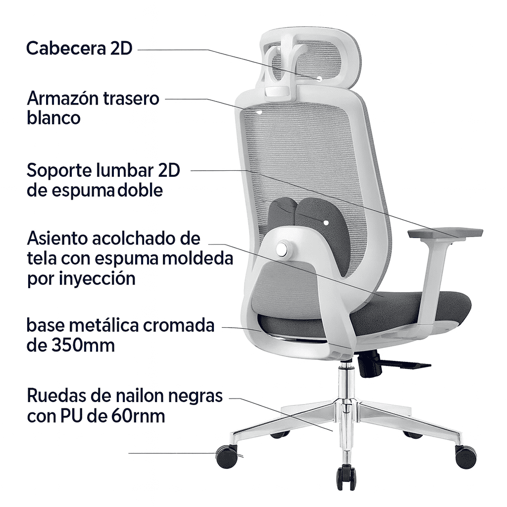 Con un mecanismo multifunción de 3 posiciones, puedes ajustar la inclinación del respaldo y bloquearlo según tu necesidad, garantizando confort personalizado en todo momento.